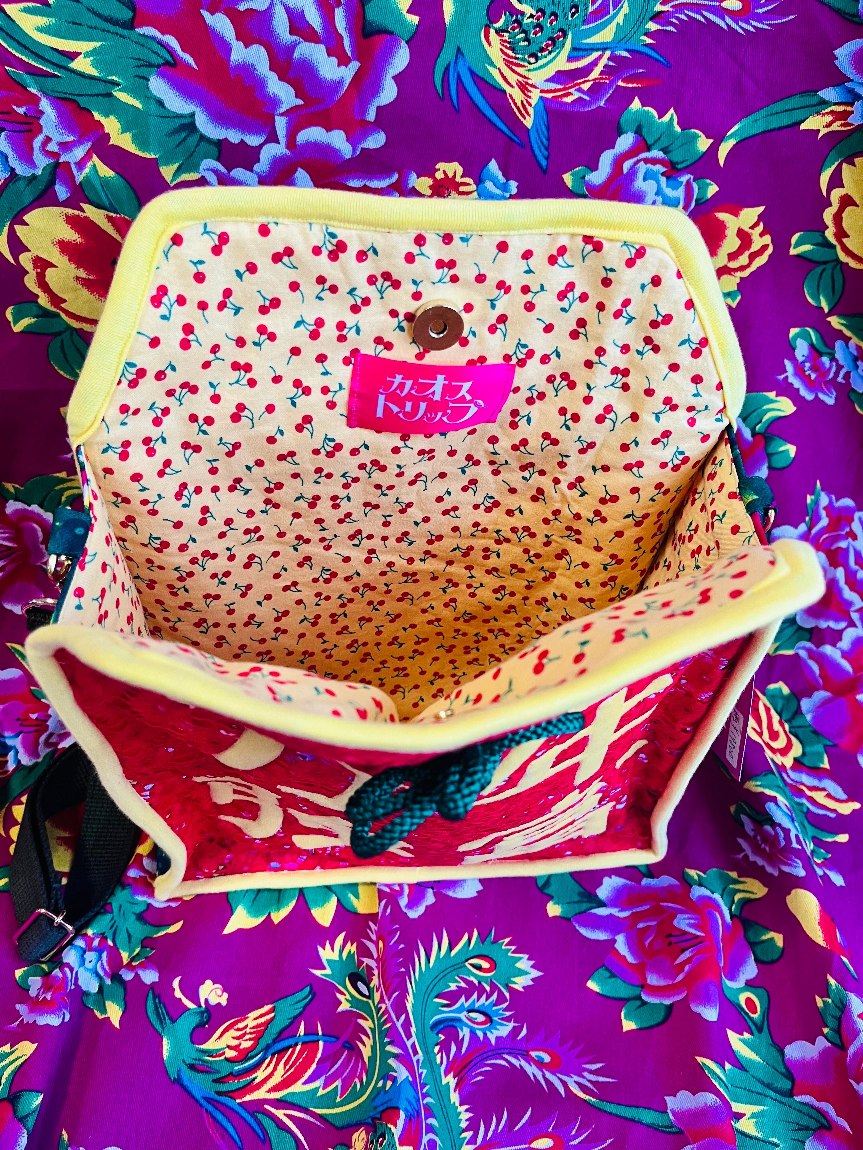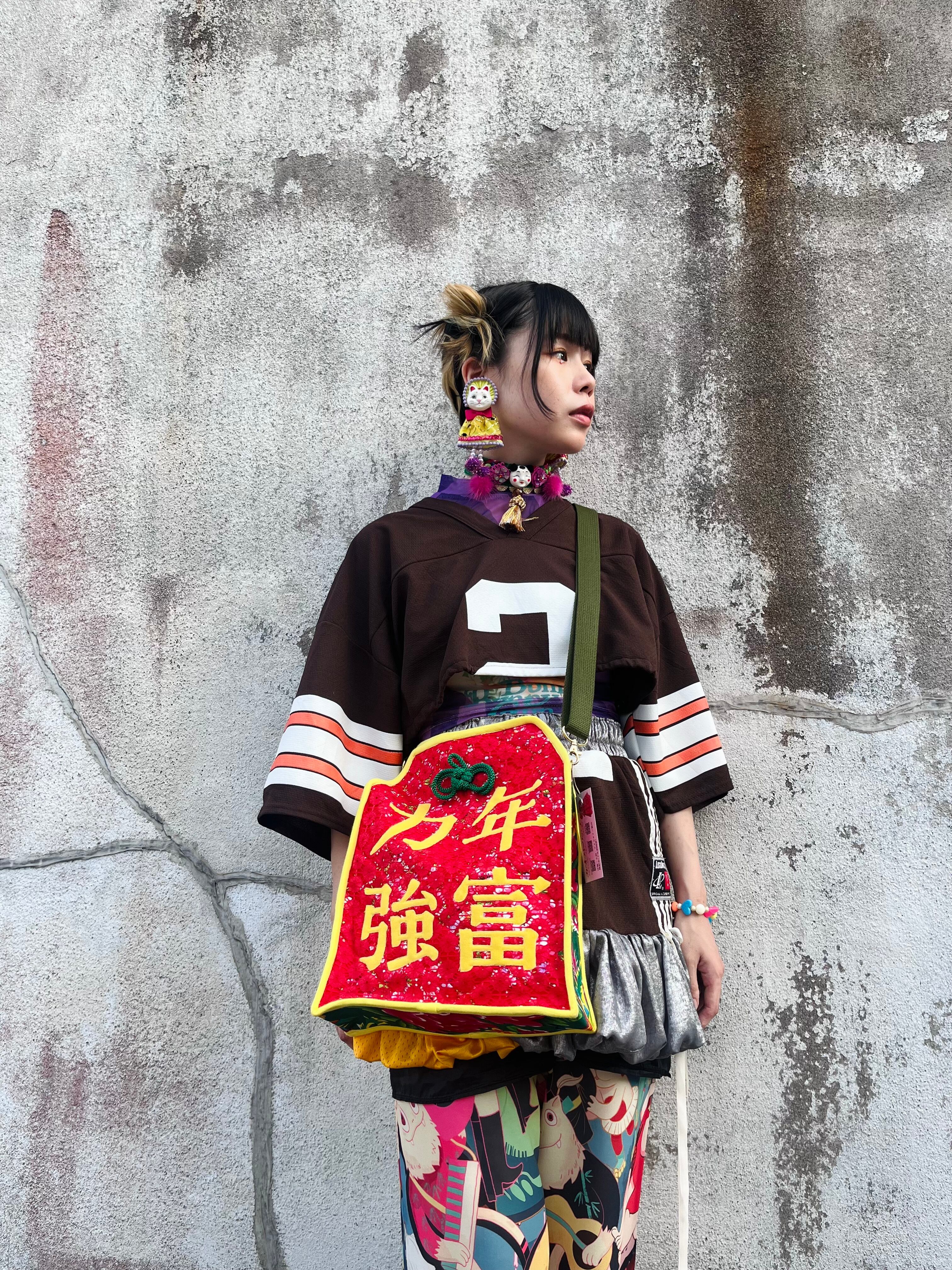 年を取るごとに豊かに、強くなっていく。そんなおめでたい四字熟語を大胆に縫い付けたインパクト抜群のショルダーバッグ。